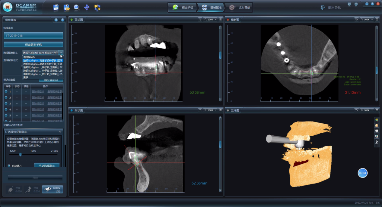 ”迪凱爾牙體牙髓手術(shù)導(dǎo)航系統(tǒng)的技術(shù)優(yōu)勢是提供精準,全程動態(tài)的器械位置指引。與靜態(tài)導(dǎo)板對比,動態(tài)導(dǎo)航的優(yōu)勢有:動態(tài)導(dǎo)航精度可以達到0.2mm,使操作更加精細和微創(chuàng),一旦術(shù)中有了偏差,醫(yī)生可以第一時間知曉,并及時做出調(diào)整;